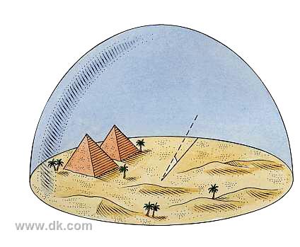 THE POSITIONS OF ALL OBJECTS IN SPACE are measured according to specific celestial coordinates. The best way to understand the cartography, or mapping, of the sky is to recall how the ancient philosophers imagined the universe was shaped. They had no real evidence that Earth moves, so they concluded that it was stationary and that the stars and planets revolve around it. They could see the stars wheeling around a single point in the sky and assumed that this must be one end of the axis of a great celestial sphere. They called it a crystalline sphere, or the sphere of fixed stars, because none of the stars seemed to change their positions relative to each other. The celestial coordinates used today come from this old-fashioned concept of a celestial sphere. The starry (celestial) and earthly (terrestrial) spheres share the same coordinates, such as a north and south poles and an equator.